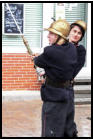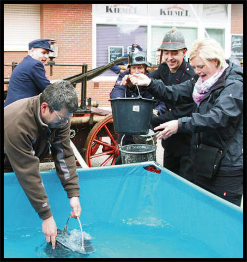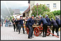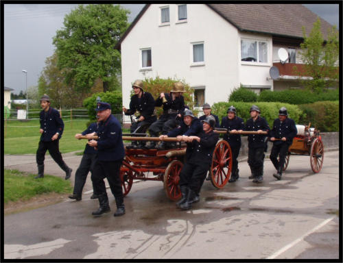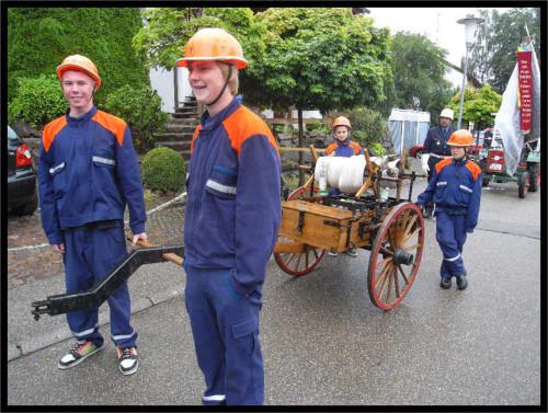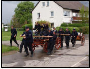 Löschspritze (Baujahr 1887) und dem “Handwagenteam” aus. Da es keine passenden Pferde gab, musste die