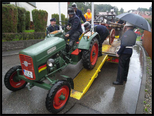 Feuerwehrteam aus Spraitbach fuhr im strömenden Regen die Feuerwehrspritze in Richtung Festgelände.