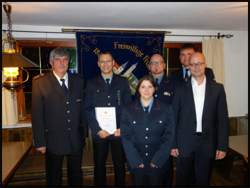 geehrt und Kevin Schurr zum Löschmeister befördert. Außerdem wurden 3 Jugendliche von der Jugendfeuerwehr
